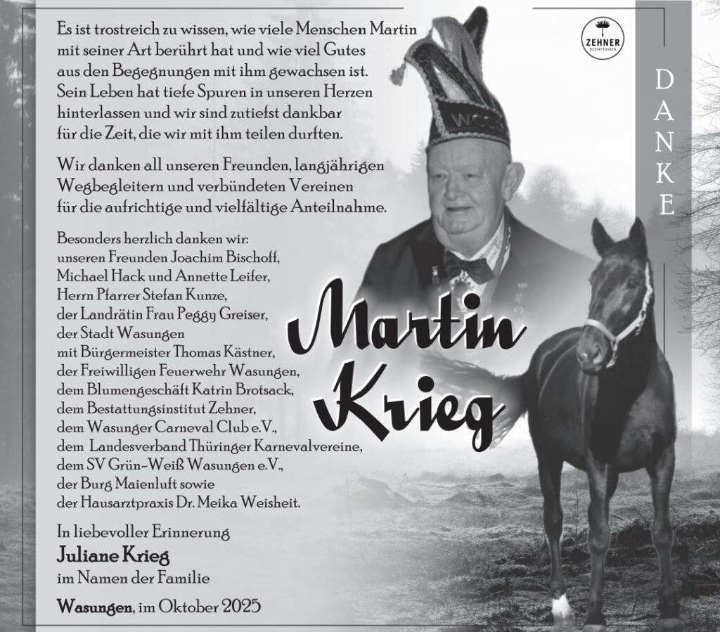 Der Landesverband Thüringer Karnevalvereine e.V. trauert um einen großen Karnevalisten, Mentor und Freund. Wir werden Martin Krieg nicht nur wegen seiner Verdienste in Erinnerung behalten, sondern auch wegen seiner Menschlichkeit, seiner Herzlichkeit und seines besonderen Humors.