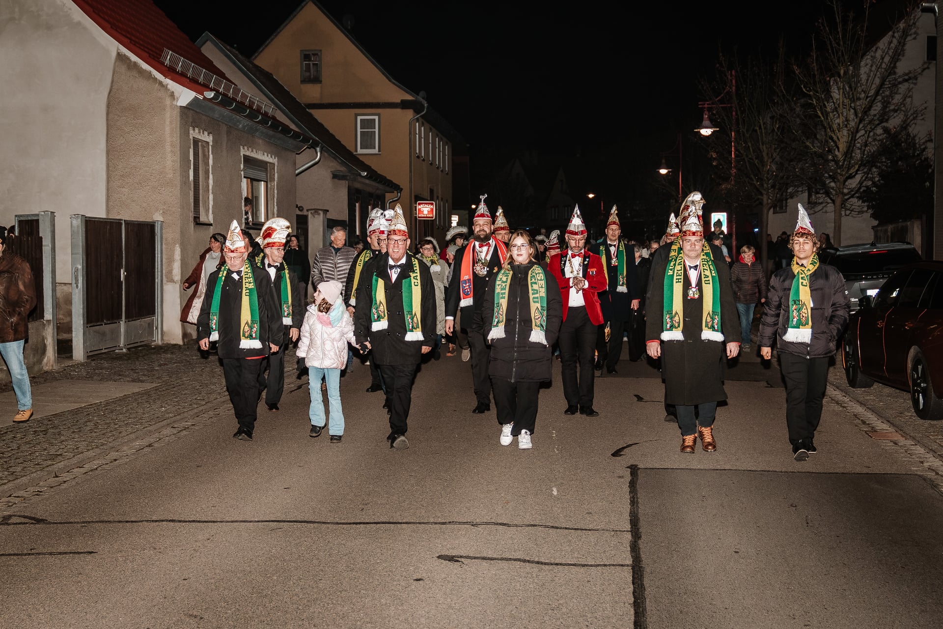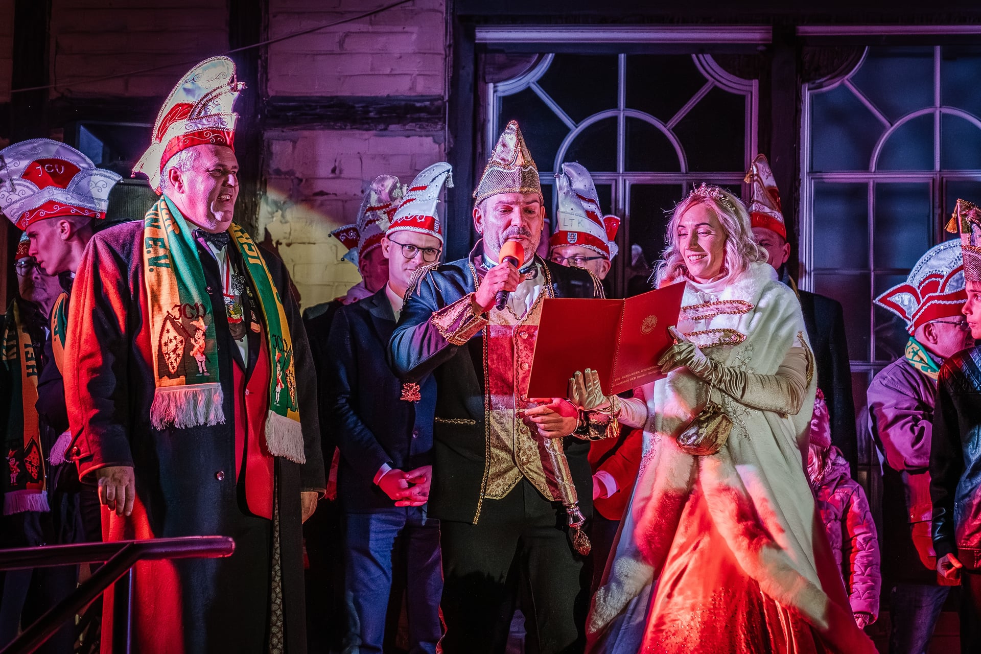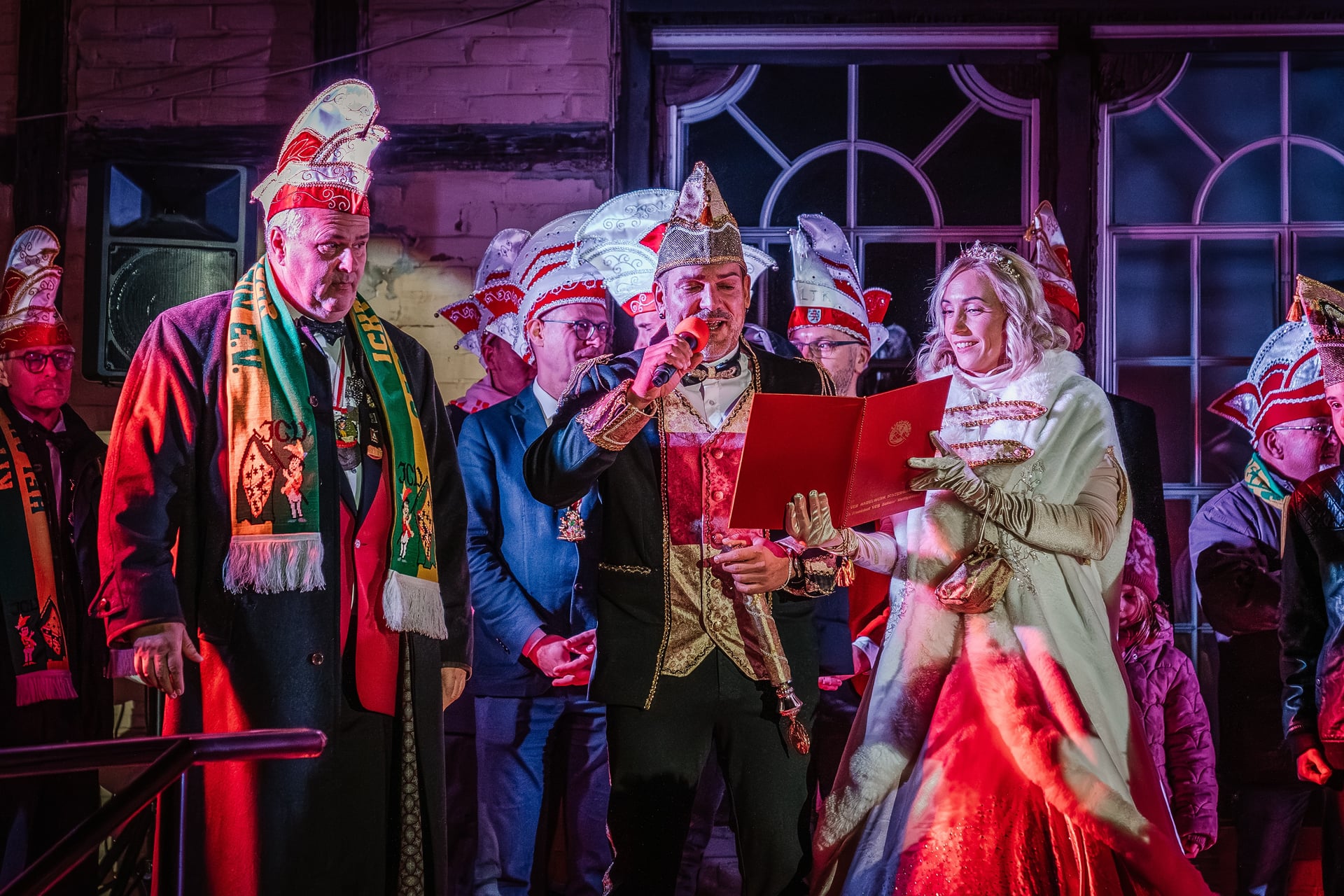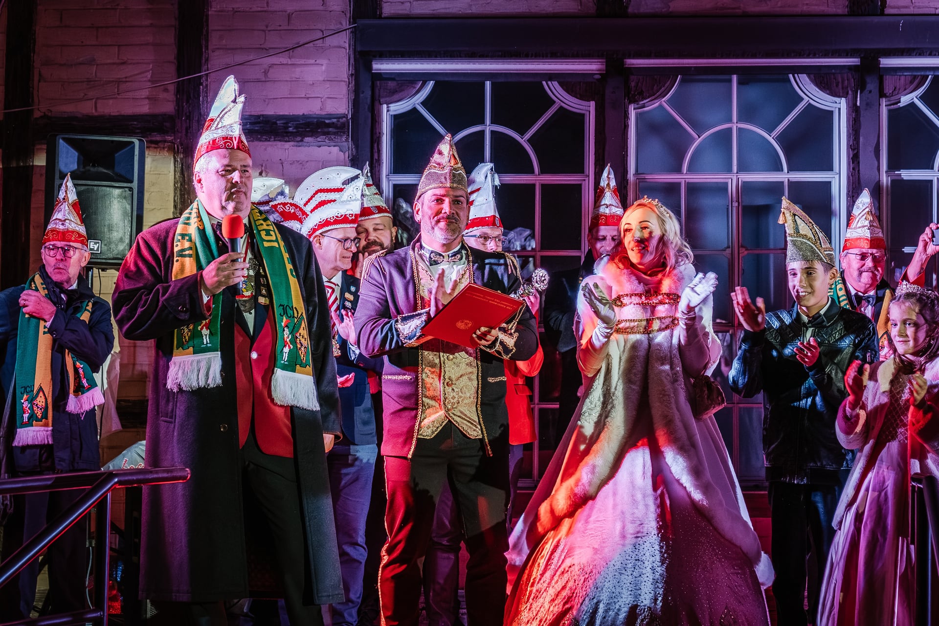 Ein Fanfarenzug führte den kleinen, aber feinen Umzug von der Schule bis zum Nadelwerk. Dort wurde das Prinzenpaar des Ichtershäuser Carnevalvereins feierlich proklamiert und intronisiert.