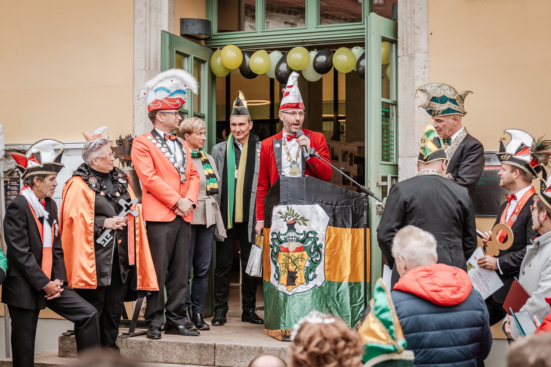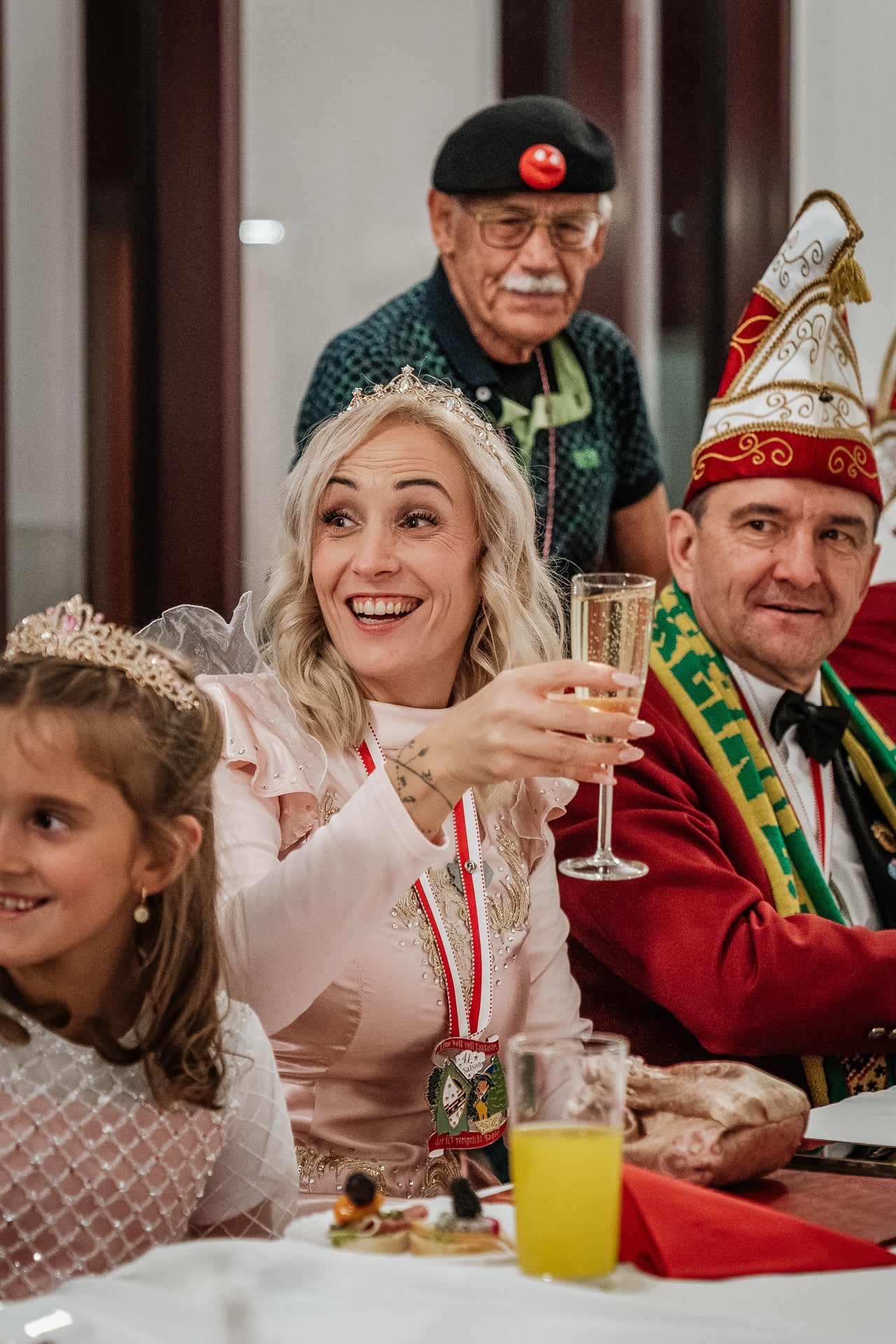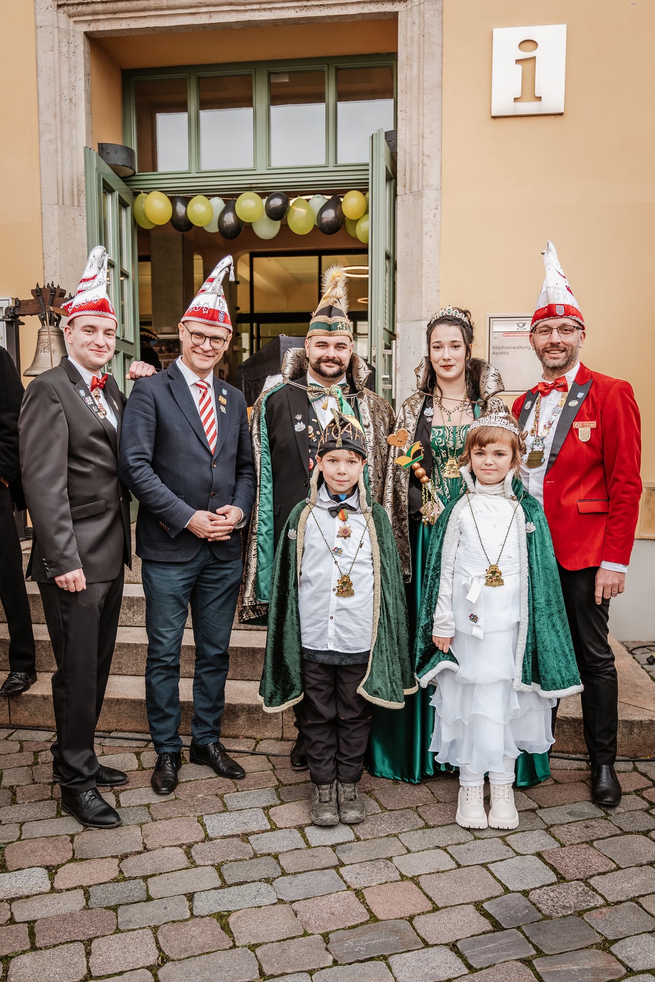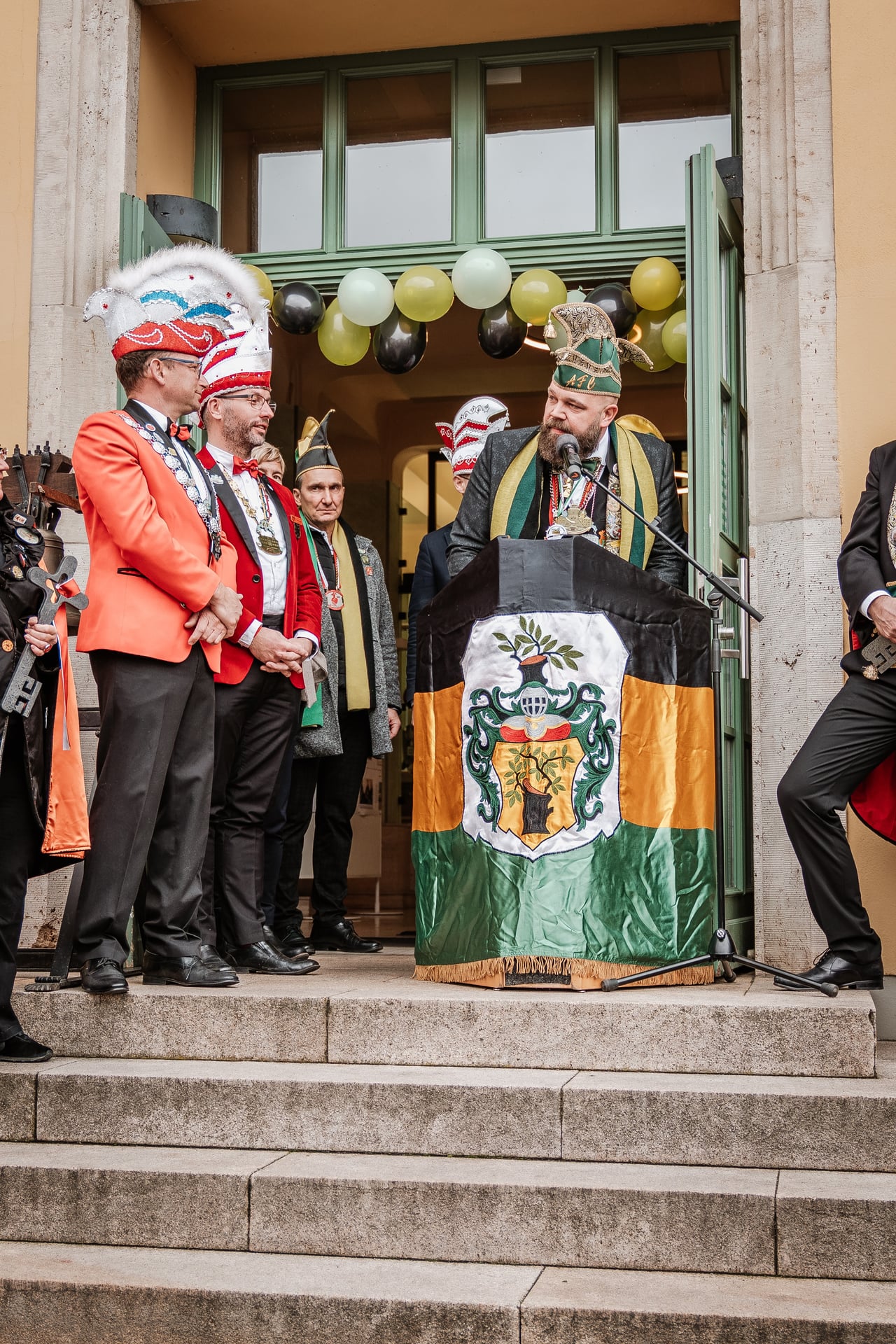 Nach der Schlüsselübergabe – und einem sensationellen „Umzugszuschlag“ von 11.111,11 Euro durch den Bürgermeister – ging es weiter ins Hotel am Schloss. Dort bewirteten Sponsoren und Unterstützer die närrische Delegation mit großem Herz und Apoldaer Bier.