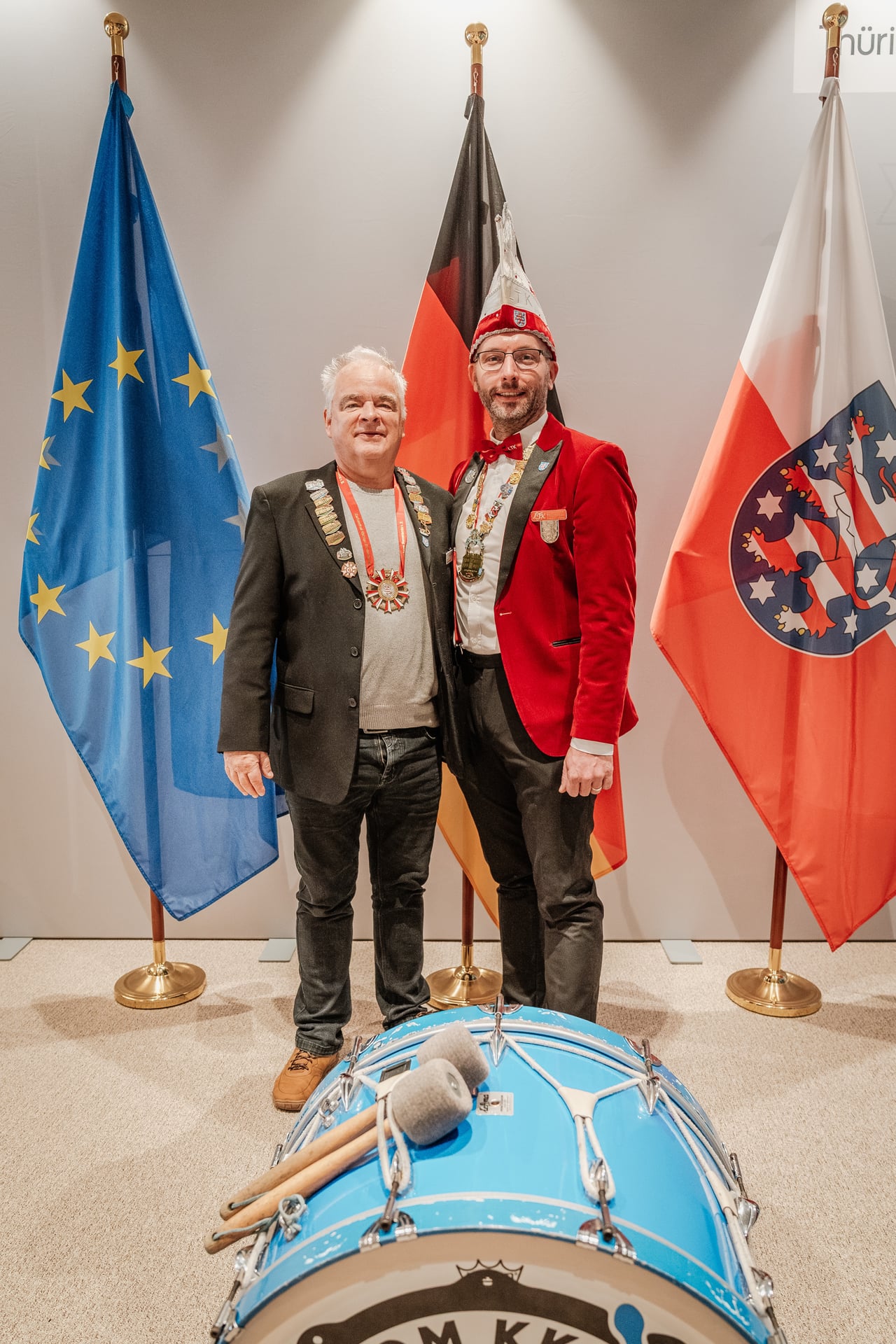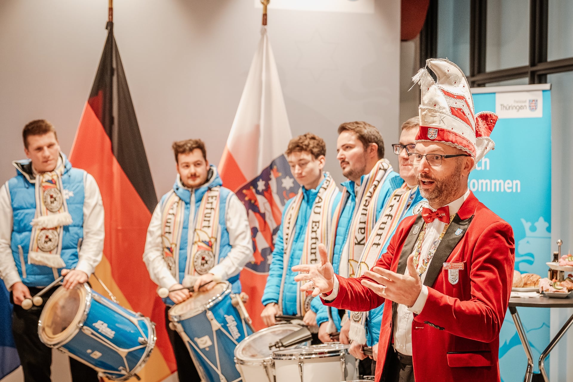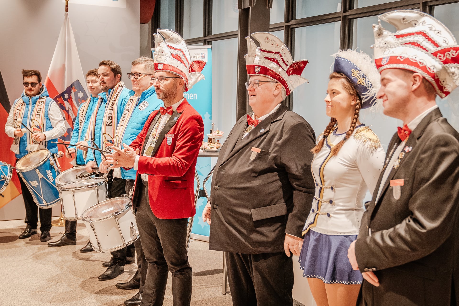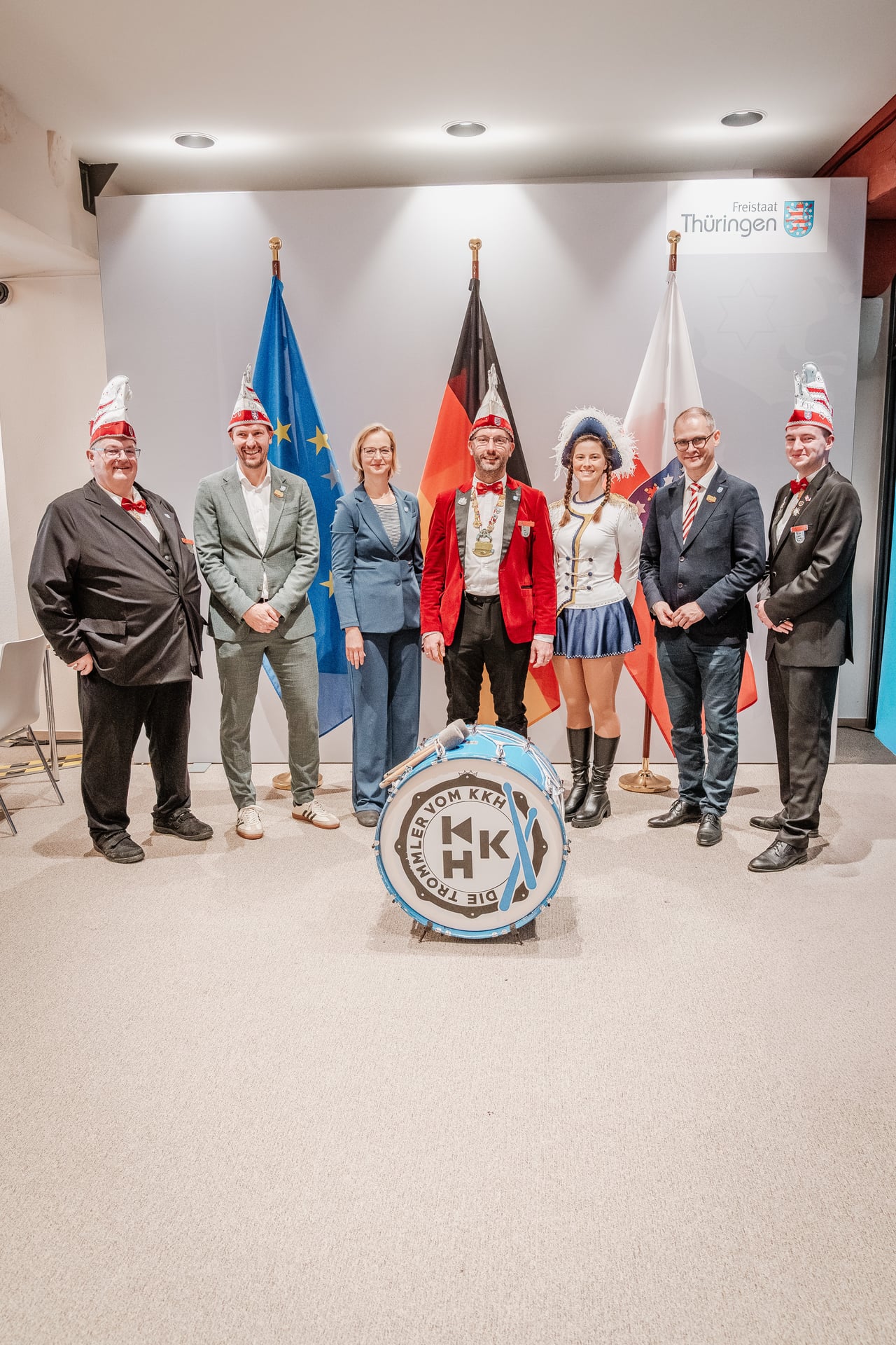 Mit Trommeln, Tempo und traditionellem Helau stürmte die Delegation den Kabinettssaal – und wurde herzlich empfangen von Katja Wolf, der stellvertretenden Ministerpräsidentin und Finanzministerin, die Ministerpräsident Prof. Dr. Mario Voigt vertrat. Dieser befand sich auf einer Auslandsreise in Israel.