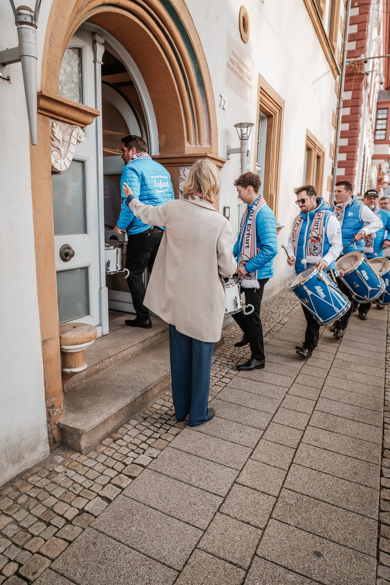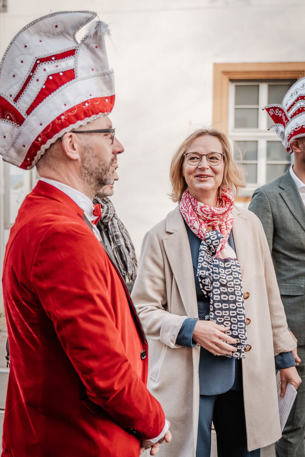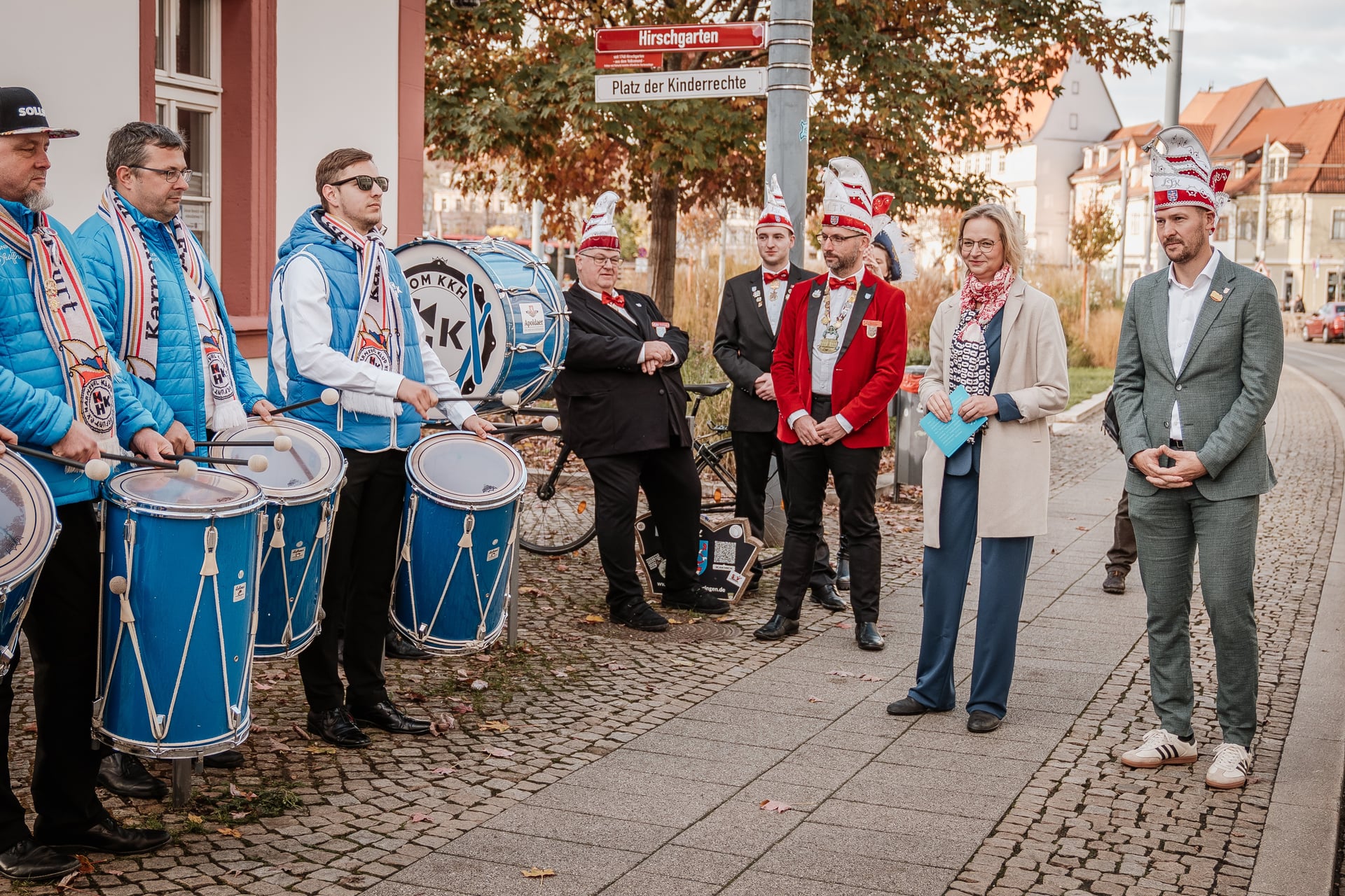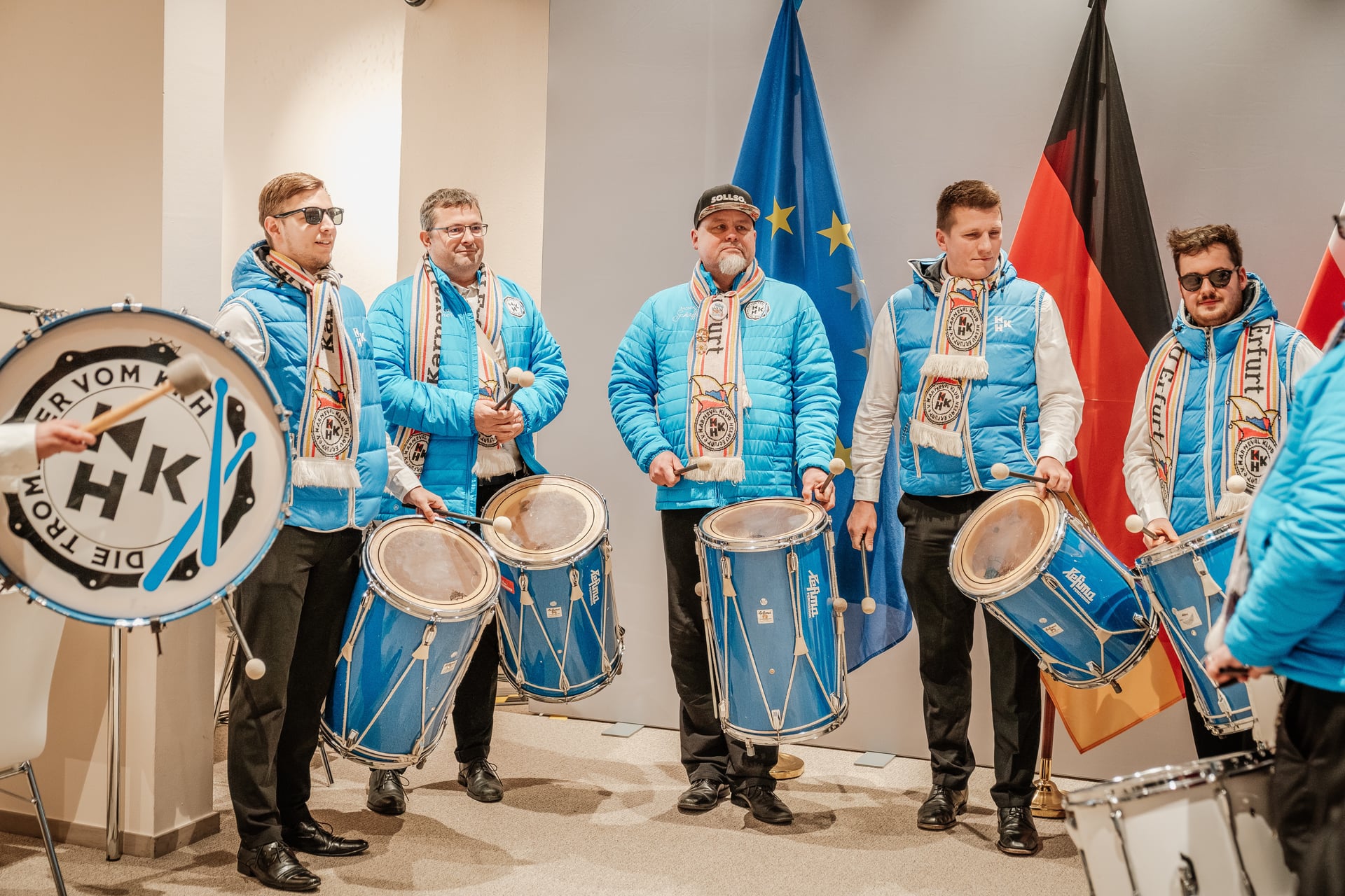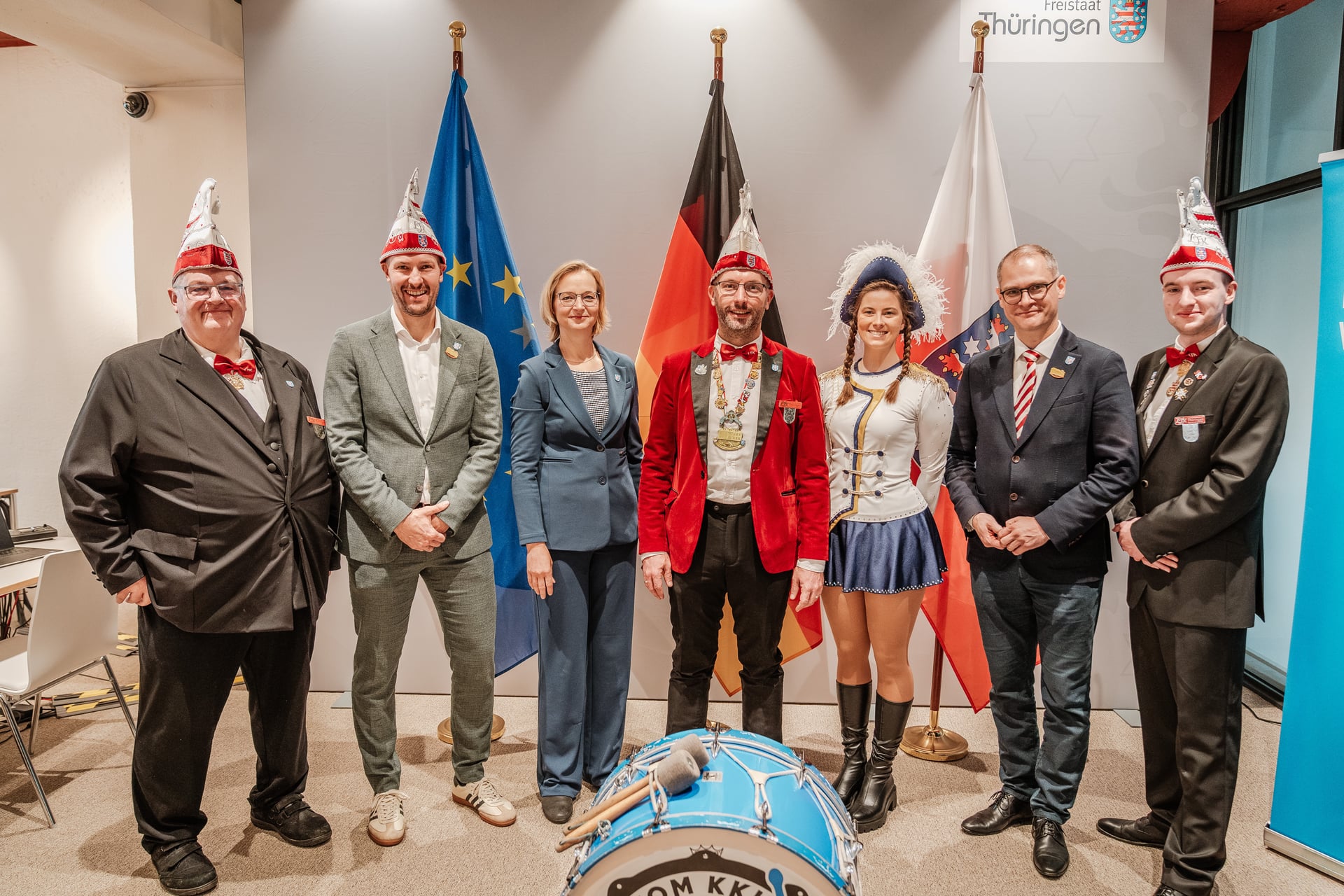 Mit Trommeln, Tempo und traditionellem Helau stürmte die Delegation den Kabinettssaal – und wurde herzlich empfangen von Katja Wolf, der stellvertretenden Ministerpräsidentin und Finanzministerin, die Ministerpräsident Prof. Dr. Mario Voigt vertrat. Dieser befand sich auf einer Auslandsreise in Israel.