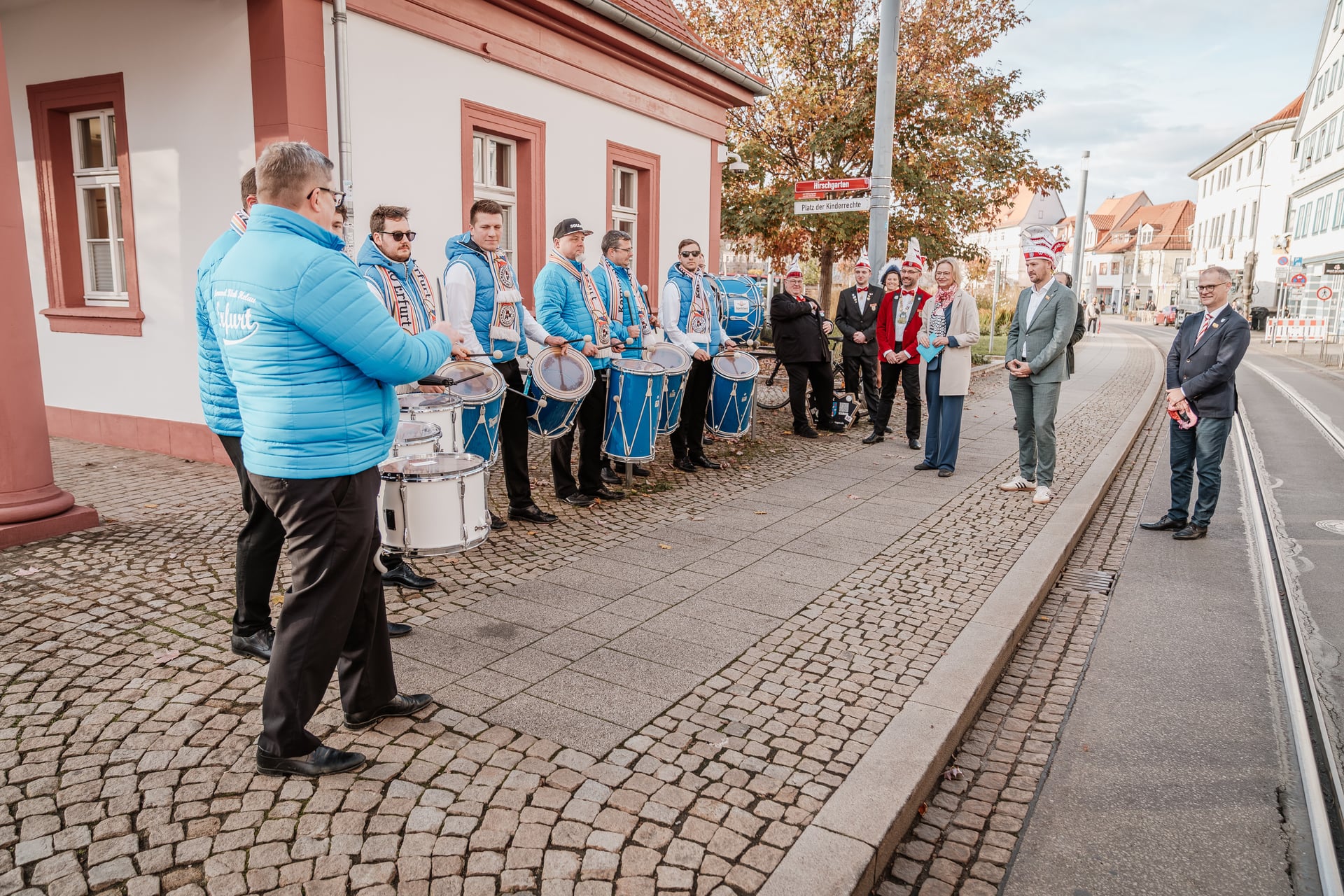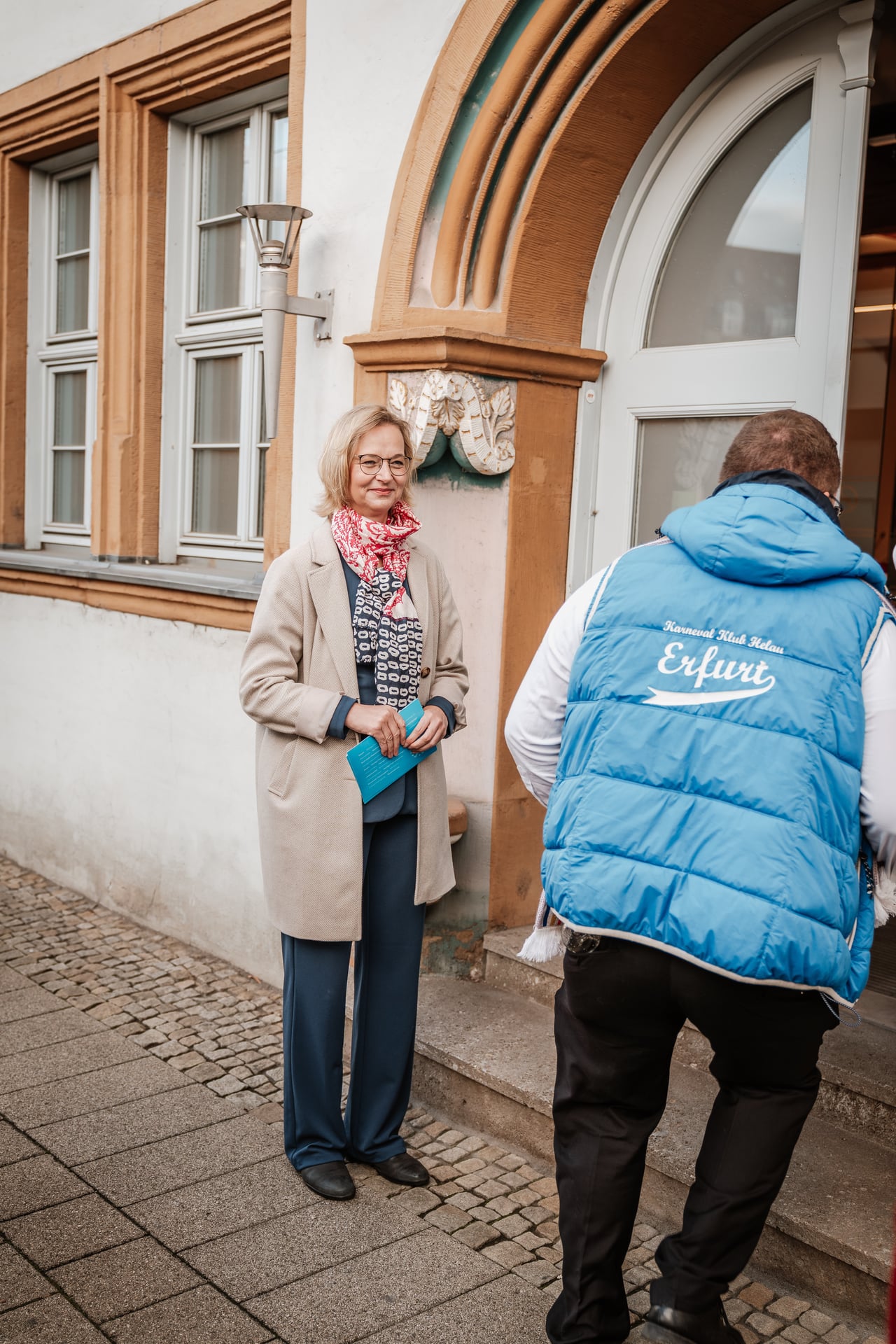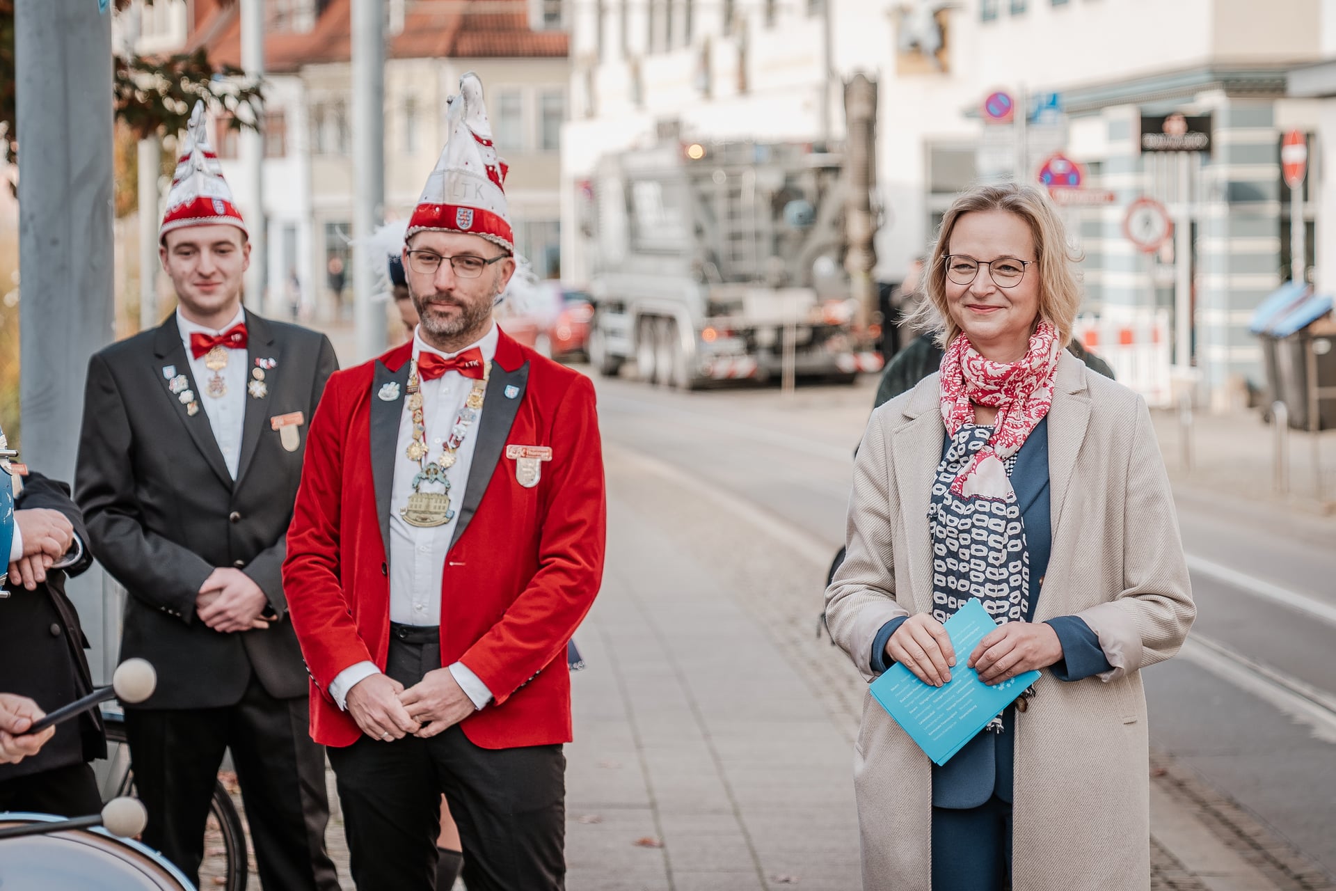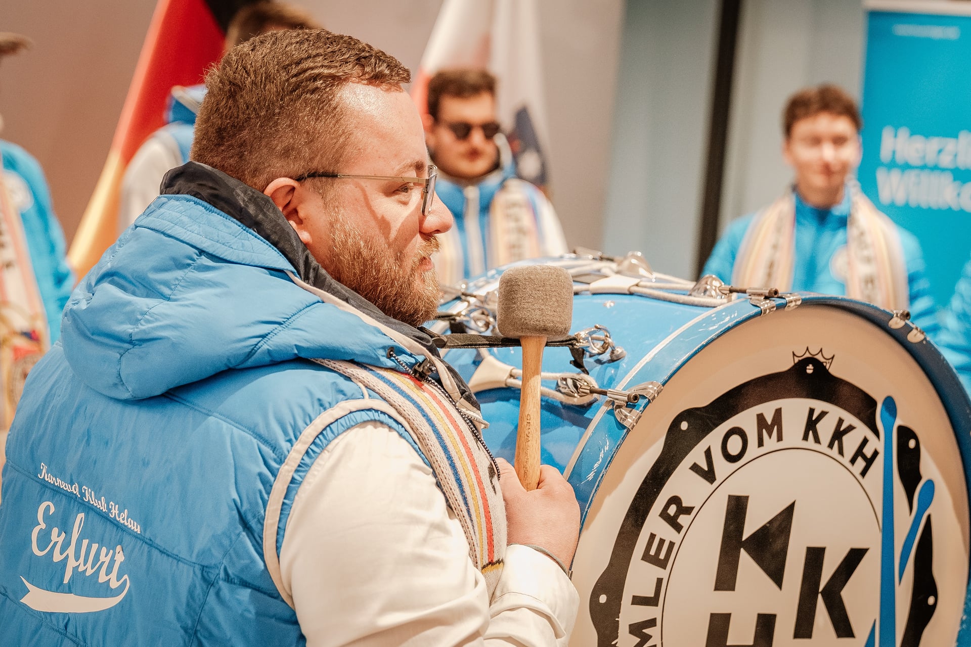 Mit Trommeln, Tempo und traditionellem Helau stürmte die Delegation den Kabinettssaal – und wurde herzlich empfangen von Katja Wolf, der stellvertretenden Ministerpräsidentin und Finanzministerin, die Ministerpräsident Prof. Dr. Mario Voigt vertrat. Dieser befand sich auf einer Auslandsreise in Israel.