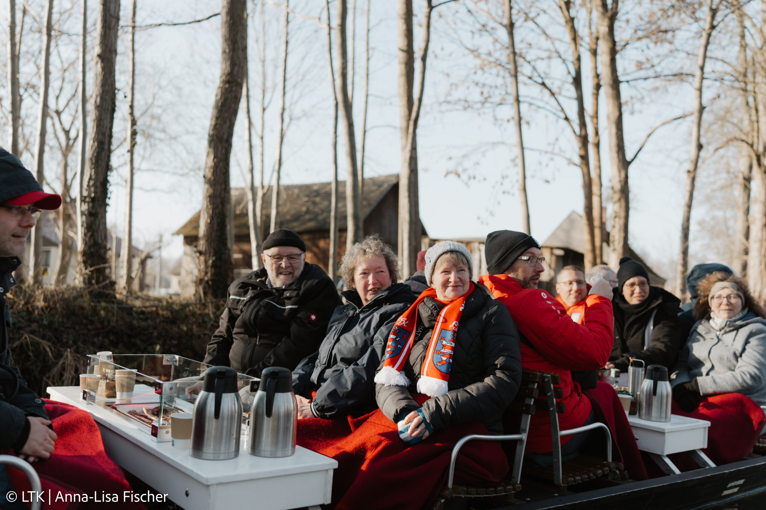 So genossen wir eine anderthalbstündige Fahrt durch die winterliche Landschaft – eingehüllt in Decken, mit heißem Tee oder Glühwein, bei Sonnenschein und glitzerndem Wasser.